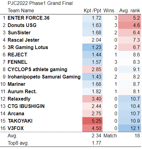 今回は、先日終了したPJC2022 Phase1 Grand Finalのデータをみていきたいと思います。