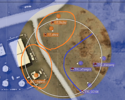 ここまでずっと安地に入り続けていた17の倉庫集落が、ここでようやく少し外れます。このまま外れていくと、17は道路を横断する必要が出てくるので、ここまで苦しかったTYLでしたが、ここにきて漸くドン勝のチャンスが生まれました。