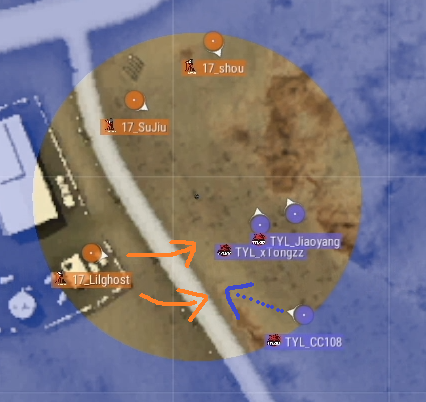 そして最終フェーズに入ります。ここでTYL側は絶対にLilghostが道路を渡れないようにして、キルを取り人数有利・エリア有利を取る必要がありました。そのためにCC108がLilghostを監視する役になります。