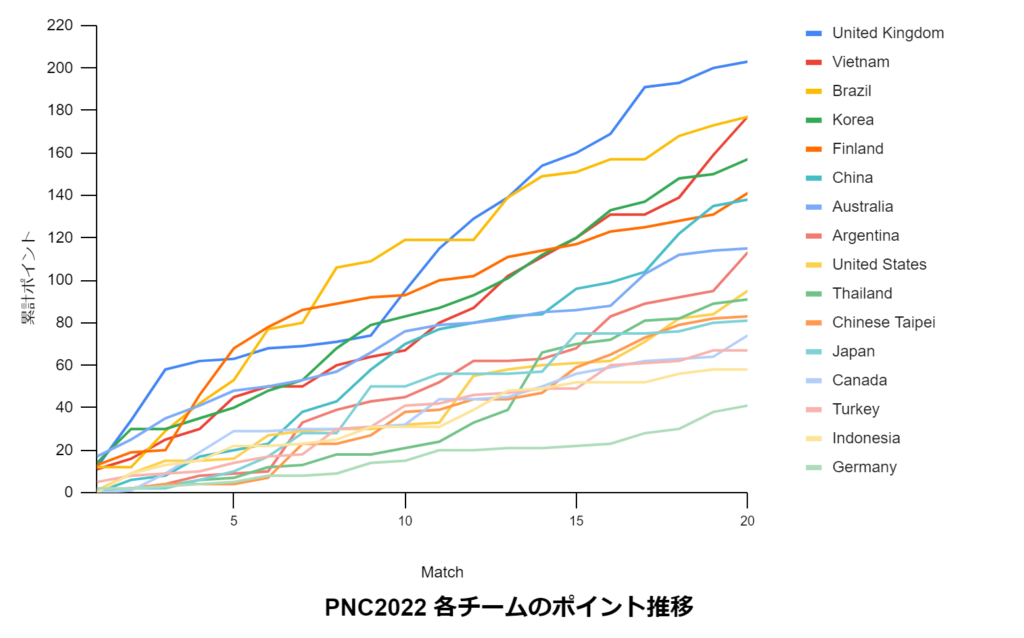 特に中国や韓国チームは、普段高いレベルでの細かい連携を取って試合を形成しているので、そこのズレの影響が大きく響いていそうです。対してベトナムやブラジルは「スタンドプレーから生じるチームワーク」といった感じのまとまり方で、それが功を奏して高得点に繋がったような気がします。