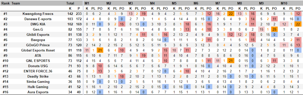 ドン勝数は、1位のKDFが一番多く5回。次いで3位のDKが4回でした。しかし、Top4率でみるとDNWが一番高くなっています。さらにTop8率ではGENが一番です。各々別の形で順位ptを安定して獲得しているようです。