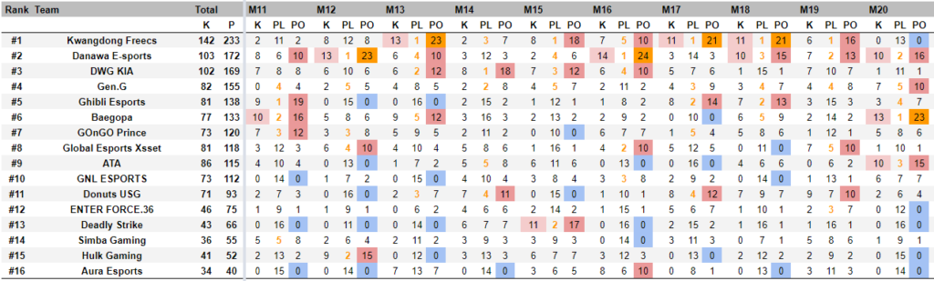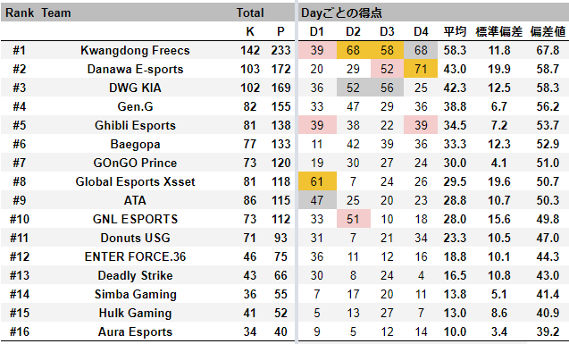 GEXは初日を1位で終えたものの、2日目は7ptと落ち込みその後も20pt台と振るいませんでした。GEXに限らず、Day1にある程度得点できたTWHKMOと日本のチームは軒並みDay2以降で苦しみました。