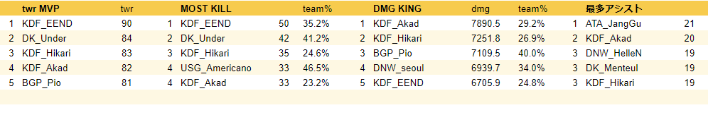 KDFはどの選手もダメージ、キルを取っているので、個人スタッツでランクインしている選手が多いです。どの選手でもキャリーが出来る強さがあります。