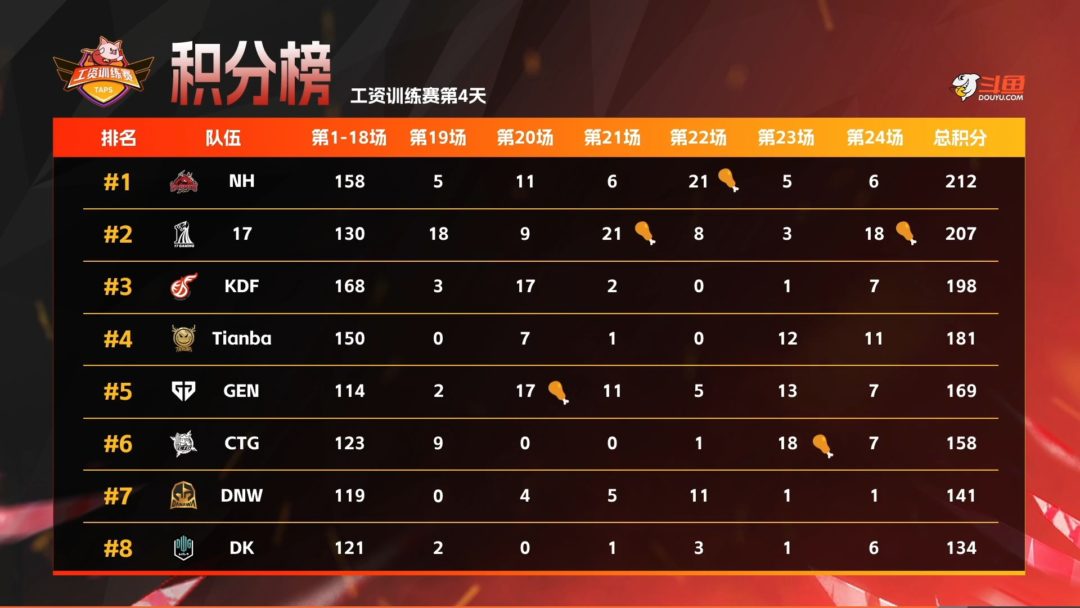 実力を反映したような結果になっていて、現在好調のNH、17がTopを争っています。そこをKDF、Tianbaが追いかけるような形です。
