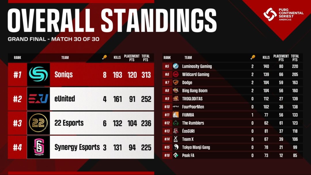【PCS7 大会データ】PUBG Continental Series 7: Americas データまとめ【PUBG】 2022年 X Facebook はてブ LINE コピー2022.10.072022.10.11スポンサーリンク 【大会データ】 Battlegrounds Smash Cup Season 8 データまとめ【PUBG】 2023.02.28 【大会結果】PGS 2 EMEA Qualifier Grand Finals【PUBG】 2023.07.11 【大会データ】 PLS 2023 Season 1 Final データまとめ【PUBG】 2023.02.15 今回はPCS7 Americasのデータをまとめました。試合をまだ見れていないので、データだけになります。目次得点表生存スタッツダメージスタッツ個人表彰投擲物スタッツ終わり得点表生存スタッツダメージスタッツ個人表彰投擲物スタッツ終わりここまで見ていただきありがとうございます。データはtwire様のものを使用しています。現在開催中のPCS7 ASIA/EUROPEも観ましょう!そしてPGCを楽しみにしましょう。それではよい観戦を。