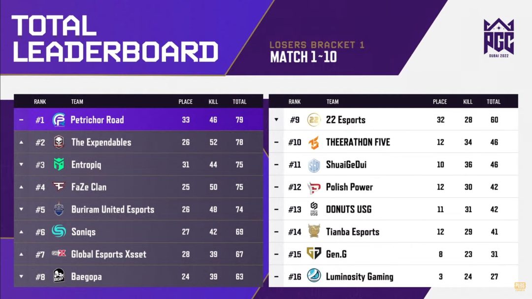 Losers Bracket 1は上位8チームがLosers Bracket 2に進出、最下位チームがPGC 2022敗退、それ以外のチームはGrand Survival行きとなる戦いでした。