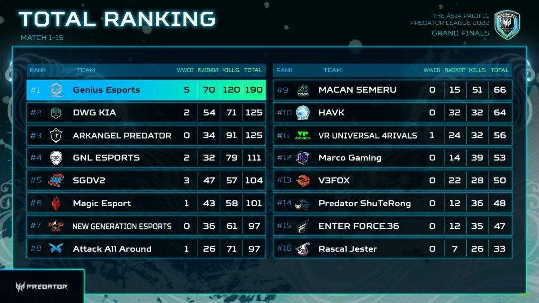 ここまで差の大きな大会は国際大会ではなかなか見ない気がします。15試合で190点はやりすぎ、いや、下位のチームがやられすぎです。GEはPCS7 APACにも出場していて、APACの中でも実力があるチームではあります。ただ、それでもまだDKを超える上手さがあるチームではないと思います。それでもこの点差をつけて優勝することが出来たのは、今大会がAPACメタであることと、上位と下位の実力差が激しいかったことが要因となっていると思います。