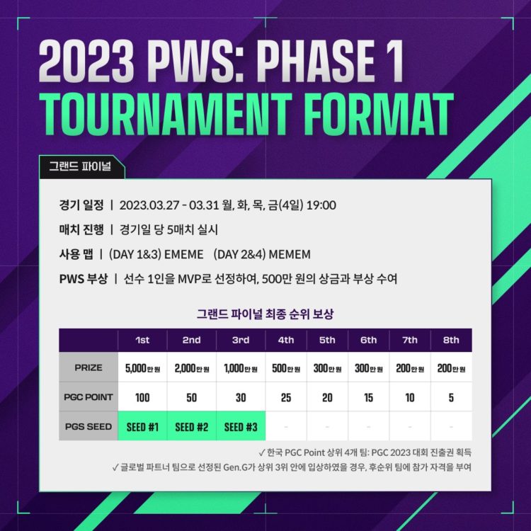 グローバルパートナーチームで既にPGS 1 の出場権を所有しているGENが 3位以内に入った場合は次点のチームが出場権を獲得する。