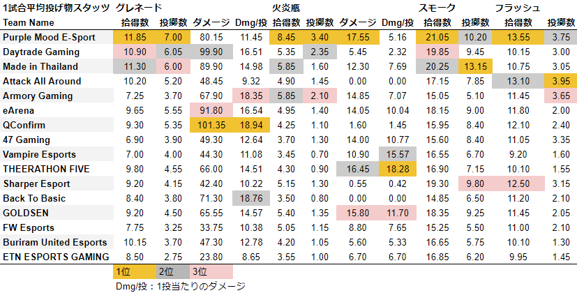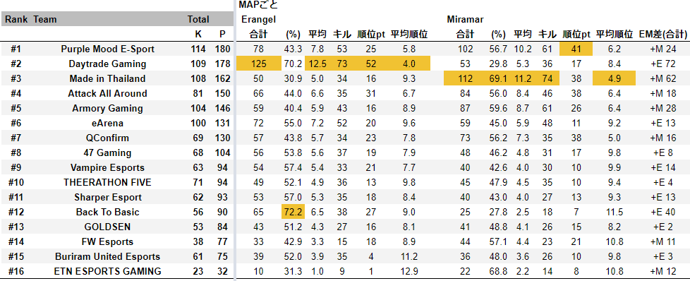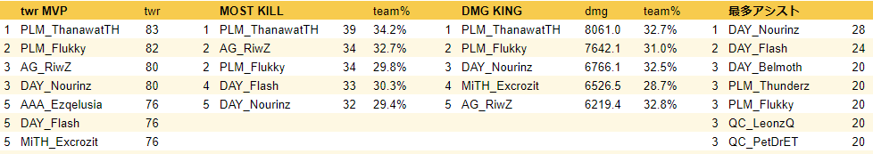 MAPによって得点が偏っているチームがやたらと多いです。特にDAYとMiThはこれだけポイントを稼いでいるなかで、70%近くのポイントをどちらかのMAPだけで獲得しているのは異常といってもいいほどです。