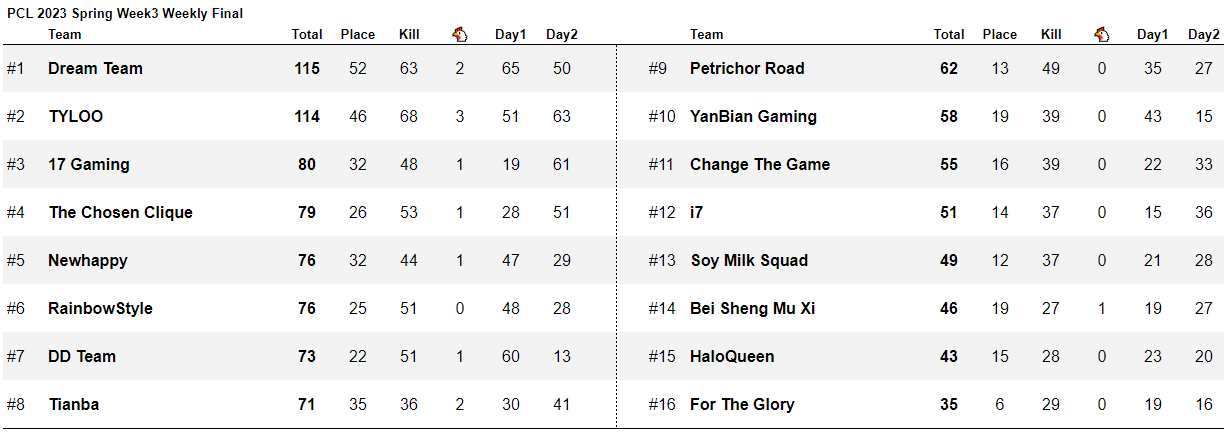 【大会データ】 PCL 2023 Spring Week3 Weekly Final データまとめ【PUBG】 2023年 X Facebook はてブ LINE コピー2023.03.29スポンサーリンク PUBG プロチームロースター情報 23年秋季 韓国チーム編【PC版】 2023.09.212023.09.28 【PUBG】Phase2 PJC~ PWS Week2 データまとめ 2022.08.022022.10.08 PGS2 Qualifiers【PUBG PC版大会情報】 2023.06.072023.06.23 今回は PCL 2023 Spring Weekly Final Week2 のデータをまとめました。Week1の記事はこちら↓【大会データ】 PCL 2023 Spring Week1 Weekly Final データまとめ【PUBG】今回は PCL 2023 Spring Week1 Weekly Final のデータをまとめました。NHがDay1(6試合) に99ptを獲得するなど、圧倒的な力を見せて見事Week1 のWeekly Finalを制しました。強豪が多い中...Week2の記事はこちら↓【大会データ】 PCL 2023 Spring Week2 Weekly Final データまとめ【PUBG】今回は PCL 2023 Spring Weekly Final Week2 のデータをまとめました。Week1の記事はこちら↓得点表順位表MatchスタッツMapごとの得点累計ptグラフ生存スタッツ各順位獲得回数生存時間、移動距離ダメージ...目次得点表順位表MatchスタッツMapごとの得点累計ptグラフ生存スタッツ各順位獲得回数生存時間、移動距離ダメージスタッツ各種ダメージダメージ内訳個人表彰投擲物スタッツ終わり得点表順位表MatchスタッツMapごとの得点累計ptグラフ生存スタッツ各順位獲得回数生存時間、移動距離ダメージスタッツ各種ダメージダメージ内訳個人表彰投擲物スタッツ終わりここまで読んでいただいた方、ありがとうございます。データはtwire様のものを使用しています。