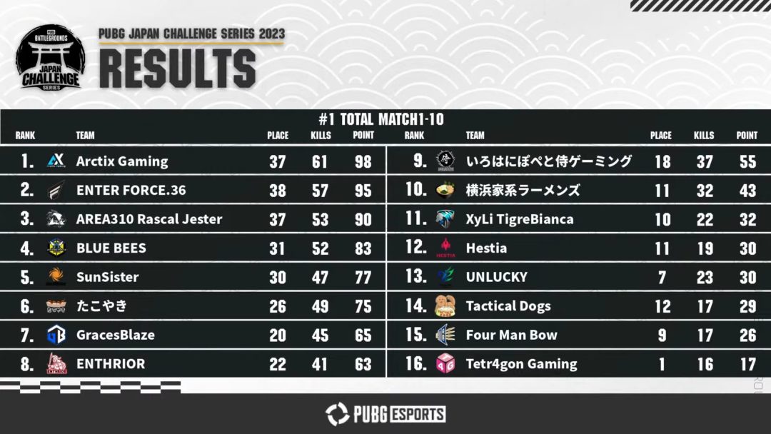 【大会結果】PJCS 2023 Phase2 サーキット#1 データ【PUBG】 2023年 X Facebook はてブ LINE コピー2023.06.05スポンサーリンク PUBG観戦勢におすすめ動画! ムーブ解説動画編【PC版 PUBG】 2022.09.202022.10.08 【大会結果】PJCS 2023 Phase2 #2 【PUBG】 2023.07.06 【大会結果】PGS 2 EMEA Qualifier Grand Finals【PUBG】 2023.07.11 目次得点表順位表MatchスタッツMapごとの得点生存スタッツ各順位獲得回数生存時間、移動距離各チームのポイント推移ダメージスタッツ各ダメージスタッツダメージ内訳個人表彰投擲物スタッツ終わり得点表順位表MatchスタッツMapごとの得点生存スタッツ各順位獲得回数生存時間、移動距離各チームのポイント推移ダメージスタッツ各ダメージスタッツダメージ内訳個人表彰投擲物スタッツ終わりここまで見ていただきありがとうございます。データはtwire様のものを使用しています。